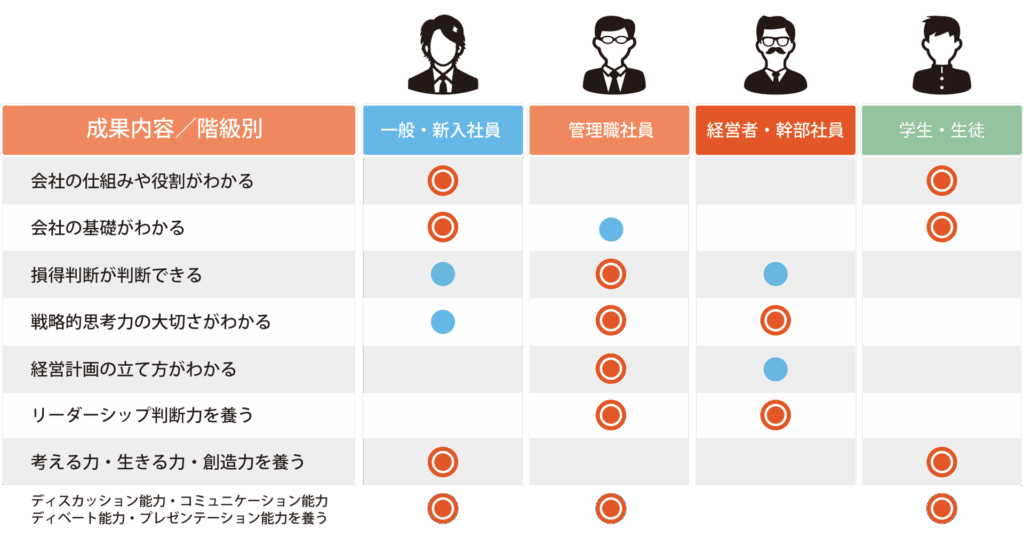 0年以上の歴史を有し、企業では1万社以上、教育機関では800校以上が採用し、これまで500万人超の受講者を排出した西順一郎氏がソニーCDIで開発したボードで行うビジネスゲームです。大変ユニークかつリアリティな社員研修プログラムであり、ゲームとはいえども思想と科学の間にある企業体験が盛り込んであるため、受講者は、利益の構造、活きた経営学・会計学を身につけることができます。